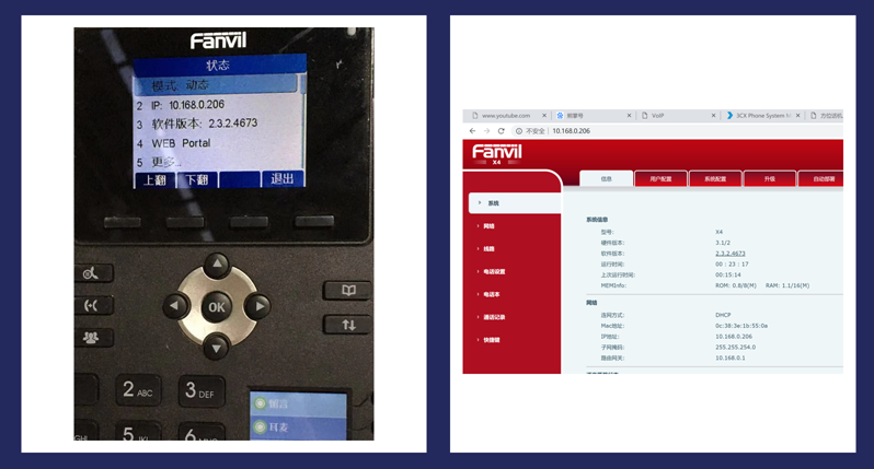 X4网络电话机采用网页进行配置。只要点击导航的下按钮,就可以查看IP地址。然后进行配置。X4支持十多种多种语言。可以满足不同语言需求的的用户。